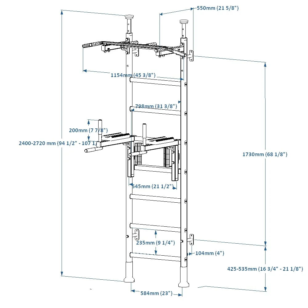 The wall bars can be mounted to wall or between floor and ceiling. An asset of BenchK 522 is an additional rung placed at the pull up bar height, which allows for a more varied range of exercise.