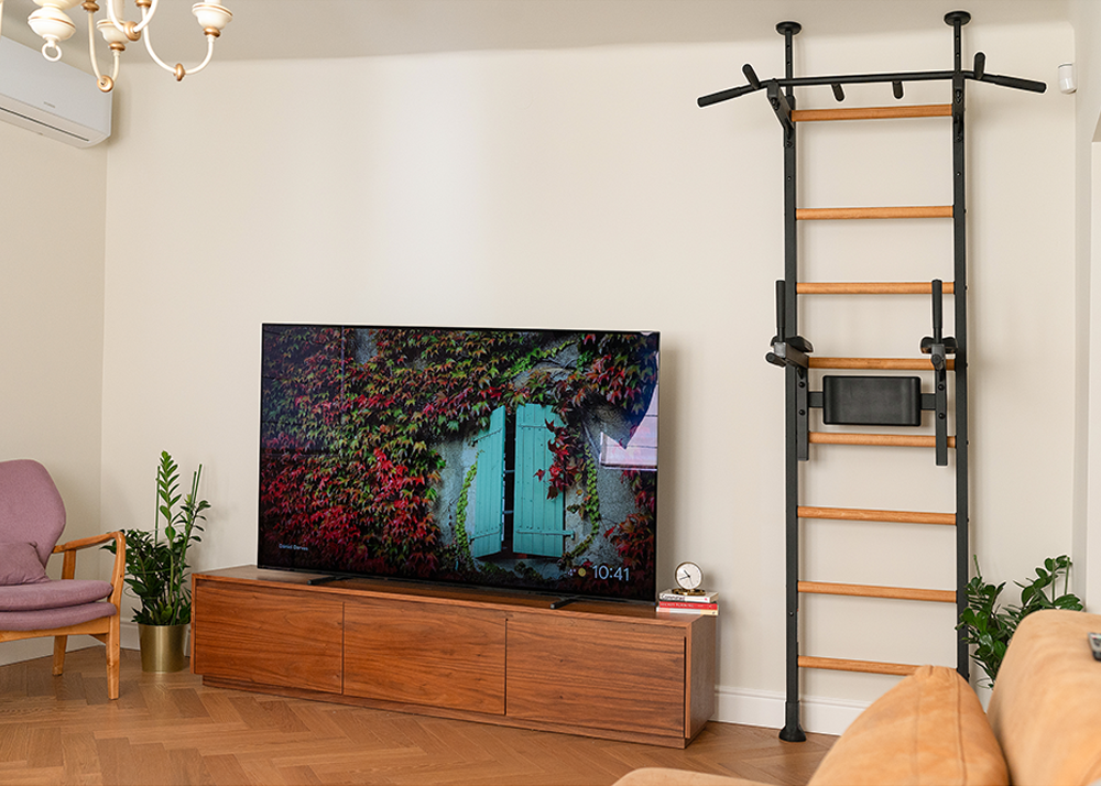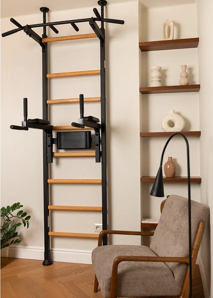 Gymnastic wall bars BenchK 522 comes with a permanently fixed pull-up bar. The wall bars are available in black and white and combines solid beech wood and steel, creating a piece of sports furniture that perfectly matches every interior.