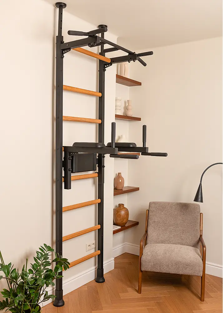 BenchK wall bars that allow floor-to-ceiling mounting or the standard wall installation with a fixed steel 6-grip pull-up bar